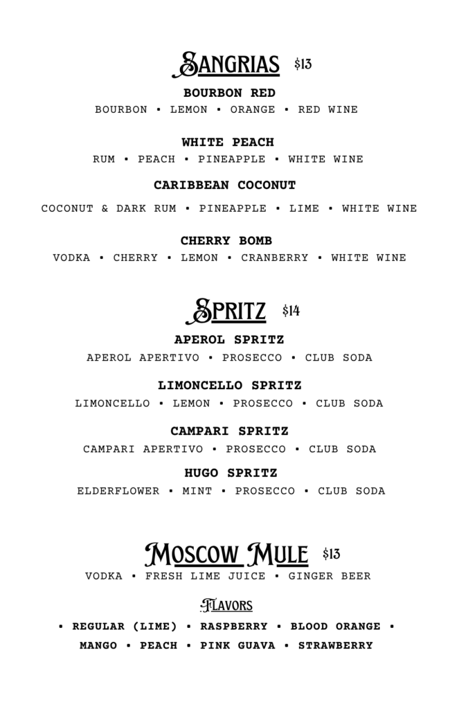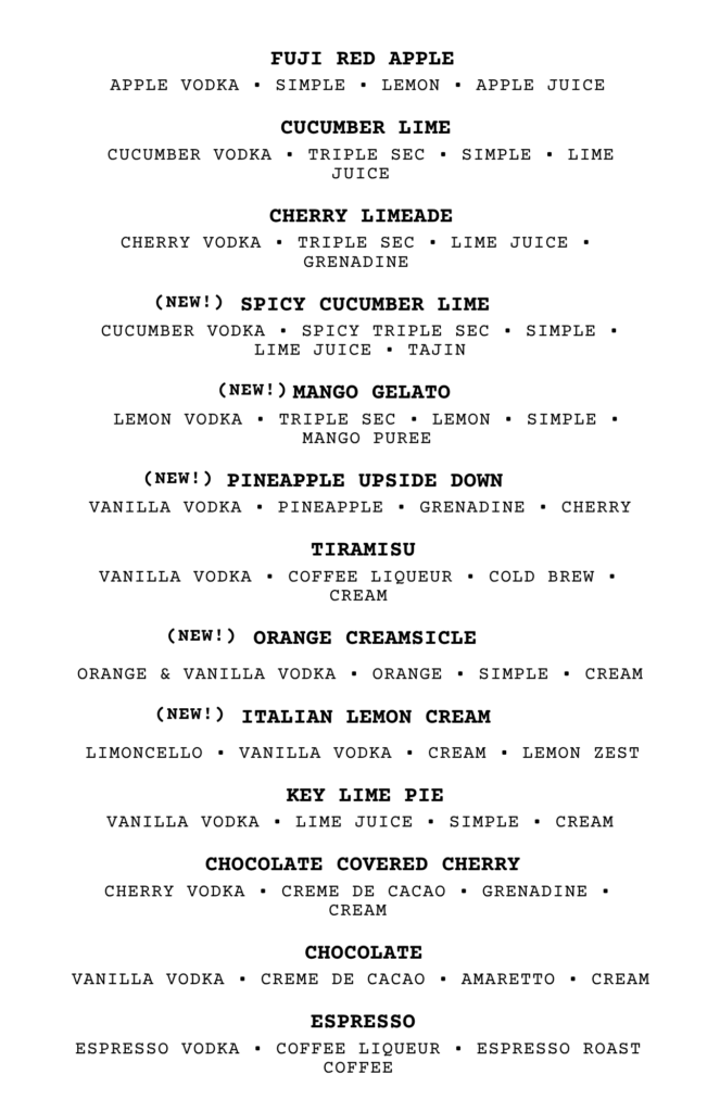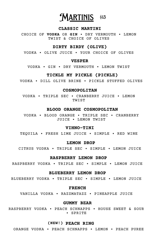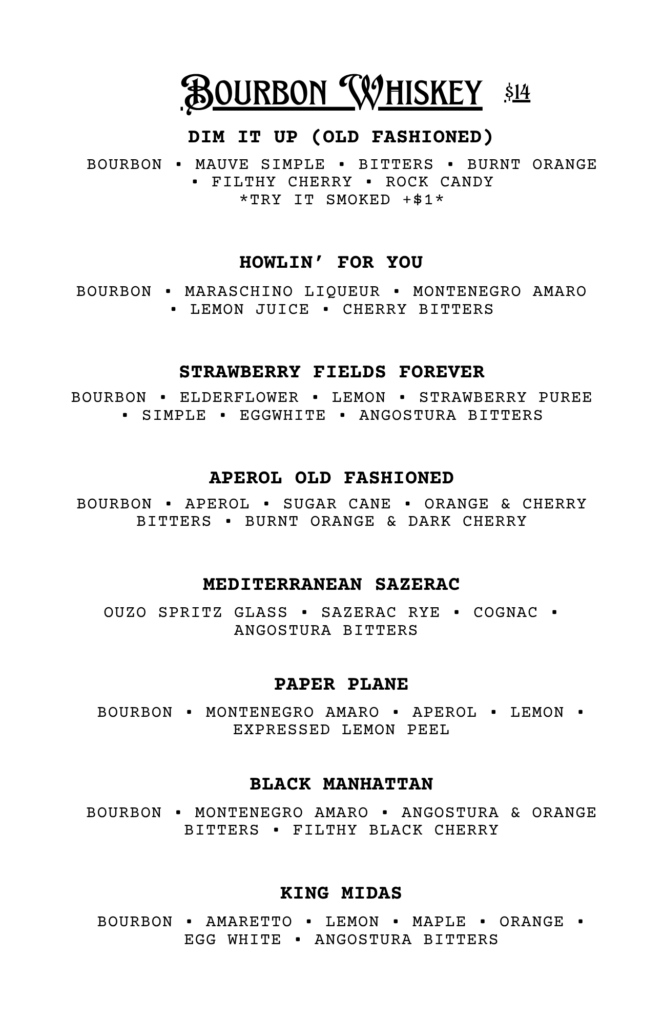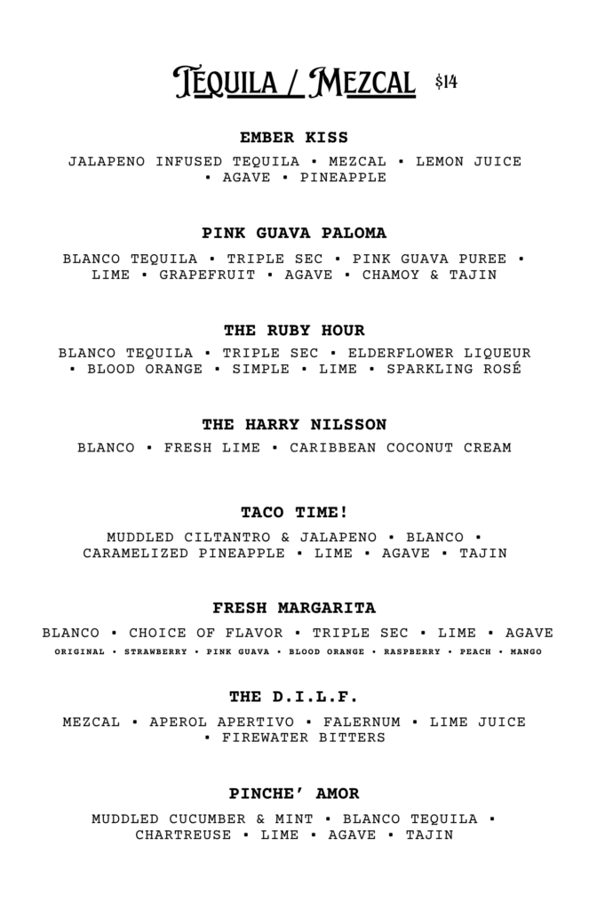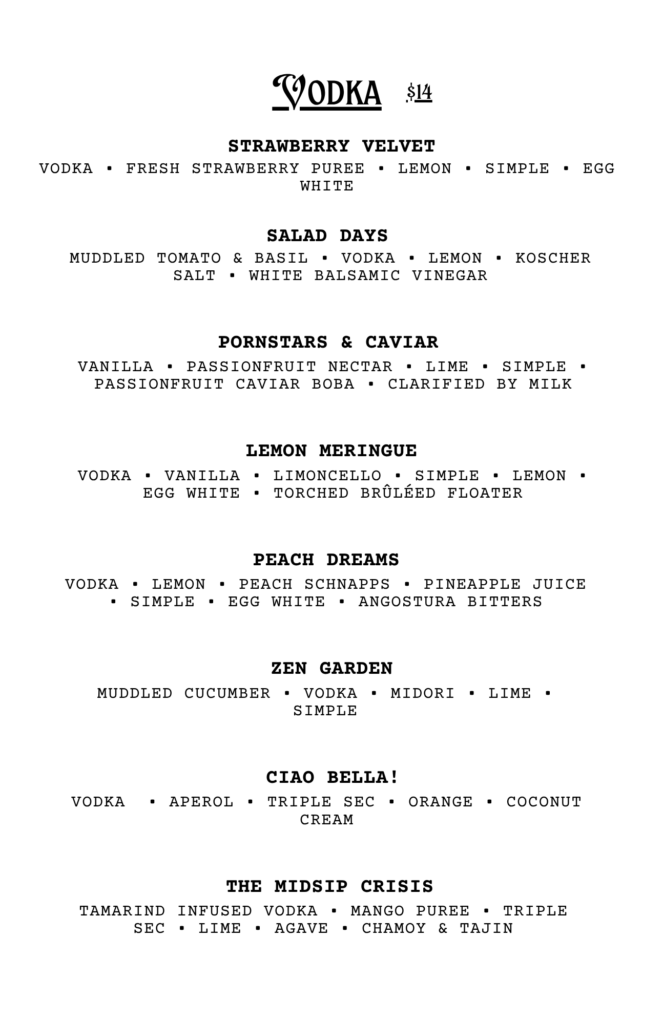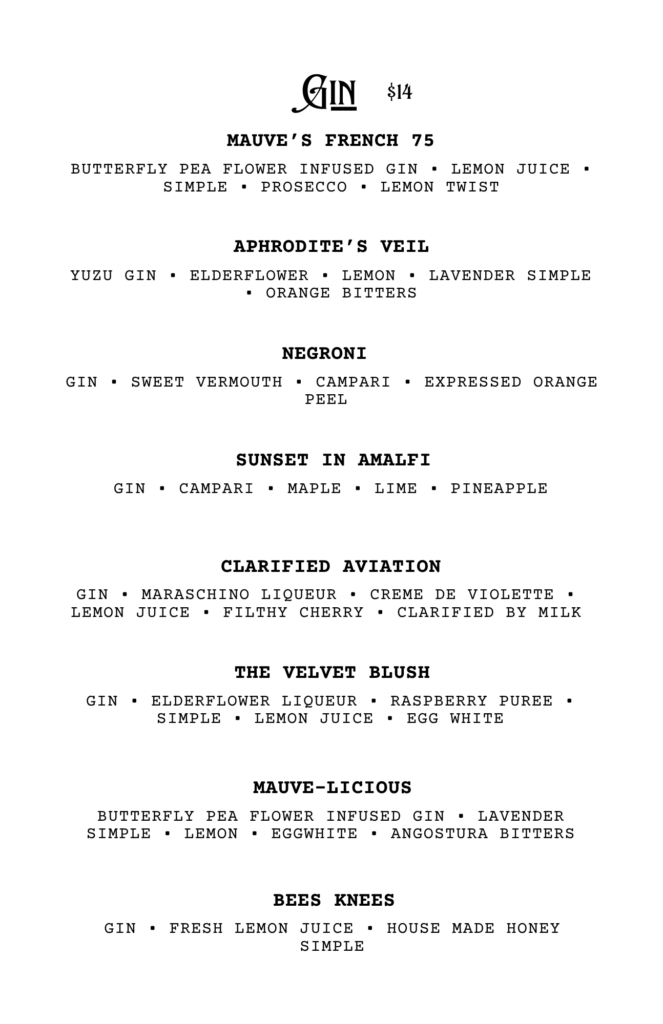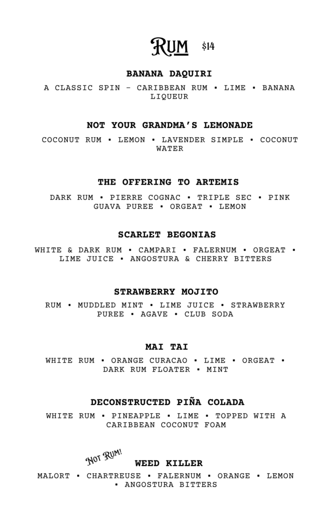 CHECK OUT OUR FOOD MENU FOR SEASONAL FOOD PAIRINGS TO ACCOMPANY YOUR COCKTAIL CHOICE!
